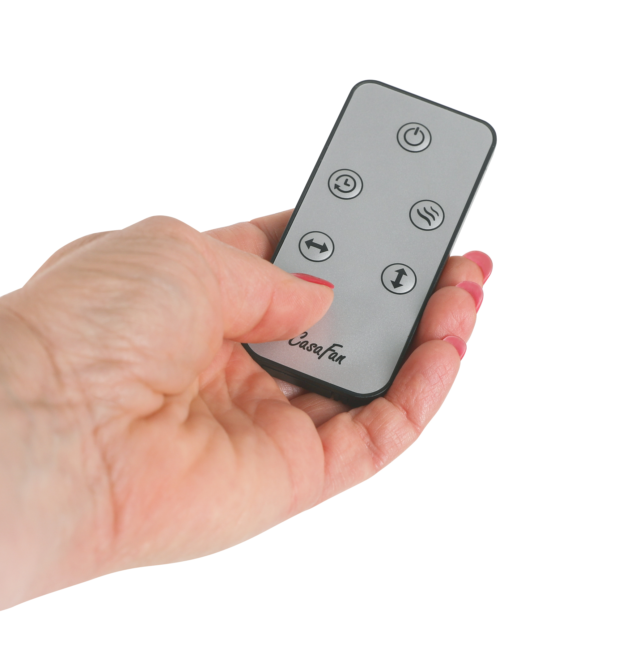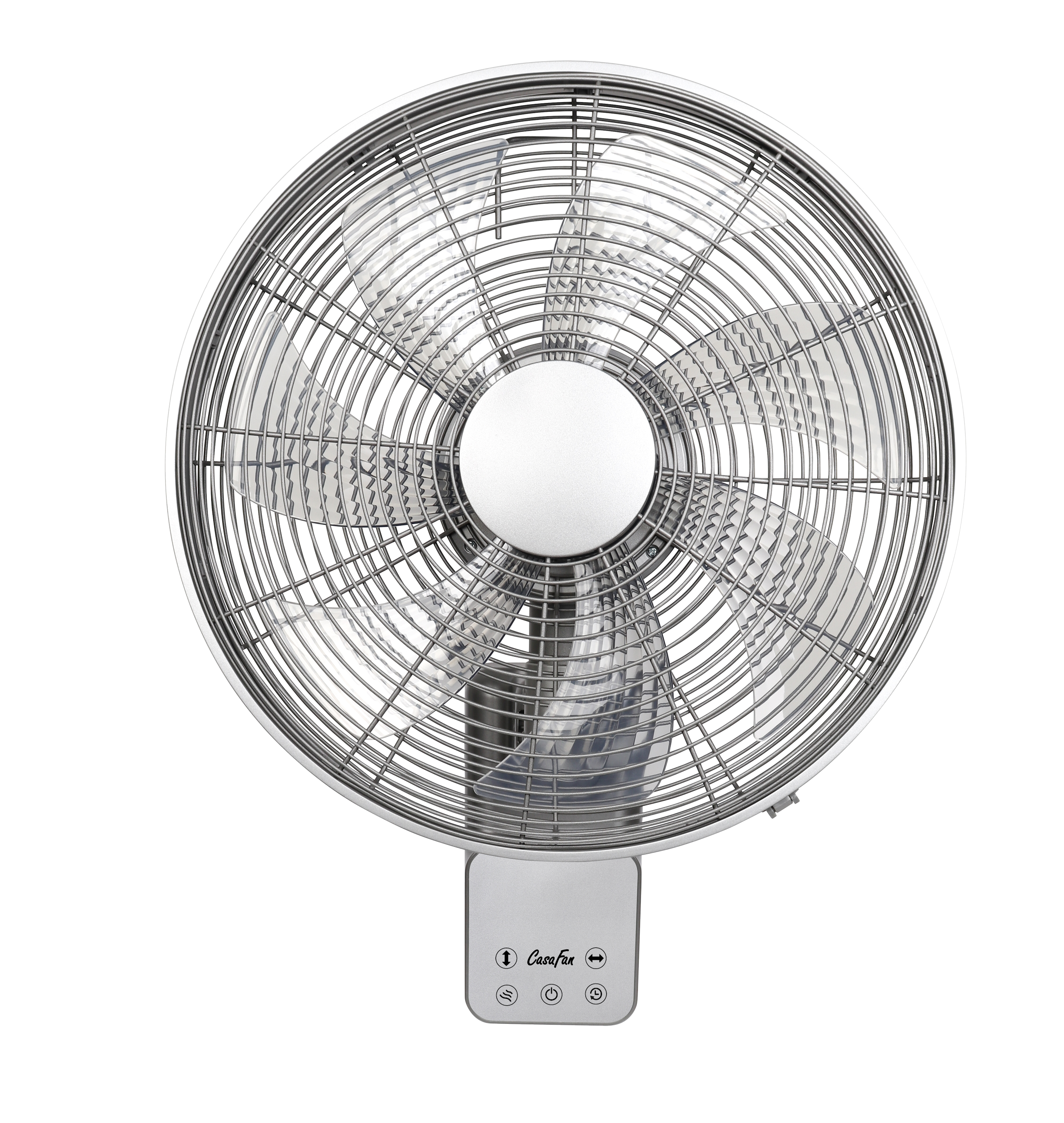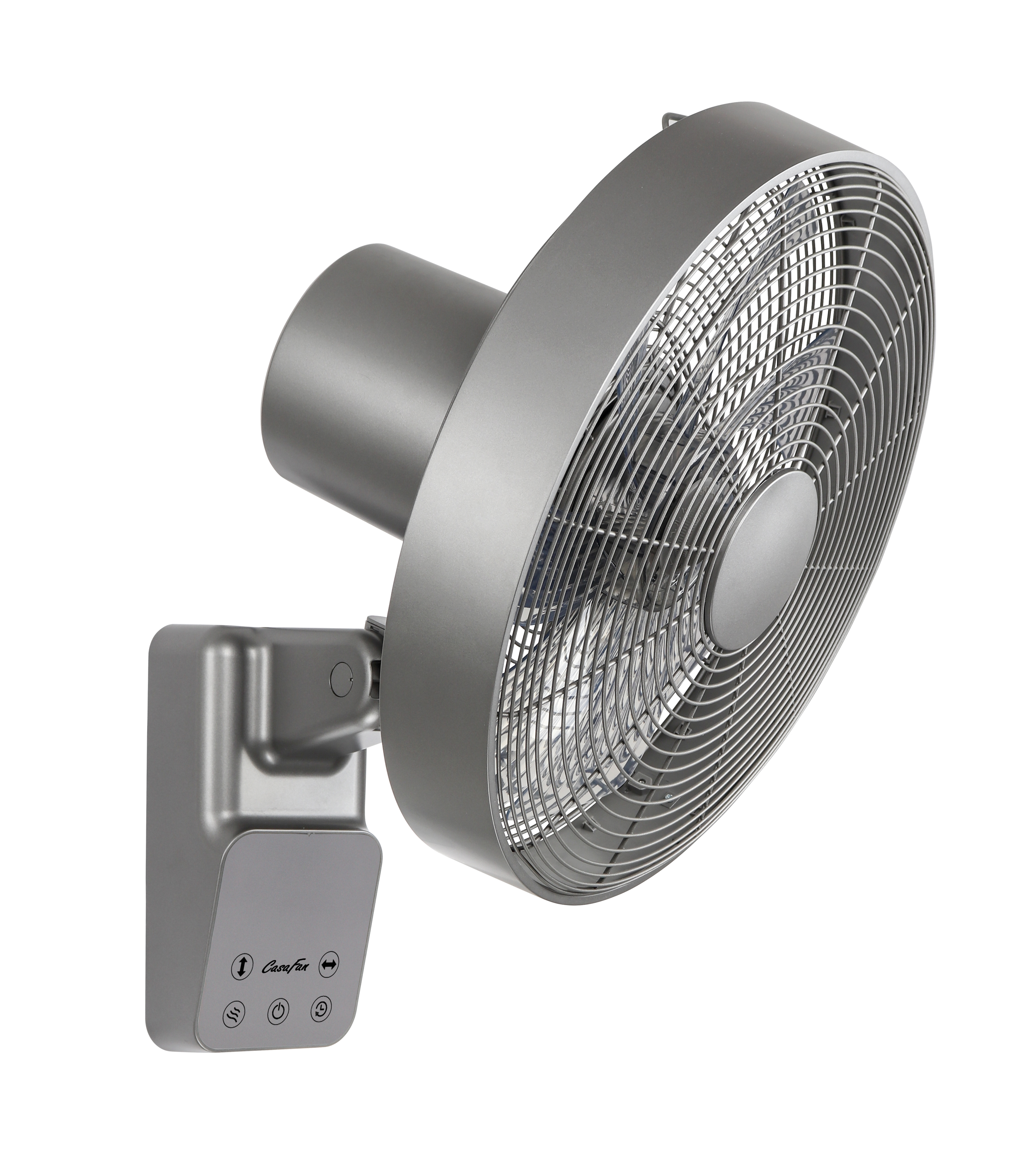 CasaFan AIROS ECO DESIGN WALL TS, Wandventilator, Leistung max. 45 W, 220-240/50 V/Hz, 5 Stufen, 1.220 U/min, Gehäuse und Gitter titansilber seidenmatt, Flügel transparent, inkl. Fernbedienung, vertikale 53°-Oszillation, horizontale 90°-Oszillation, 7-blättriges, optimiertes Flügelrad für beste Luftleistung bei gerimgem Verbrauch, LED-Anzeige der Funktionen, Korbneigung in 3 Stufen verstellbar,  1,8 m Zuleitung mit Euro-Flachstecker, zertifiziert nach Maschinenrichtlinie 2006/42/EG Teil 1 zur Verwendung im Gewerbe.