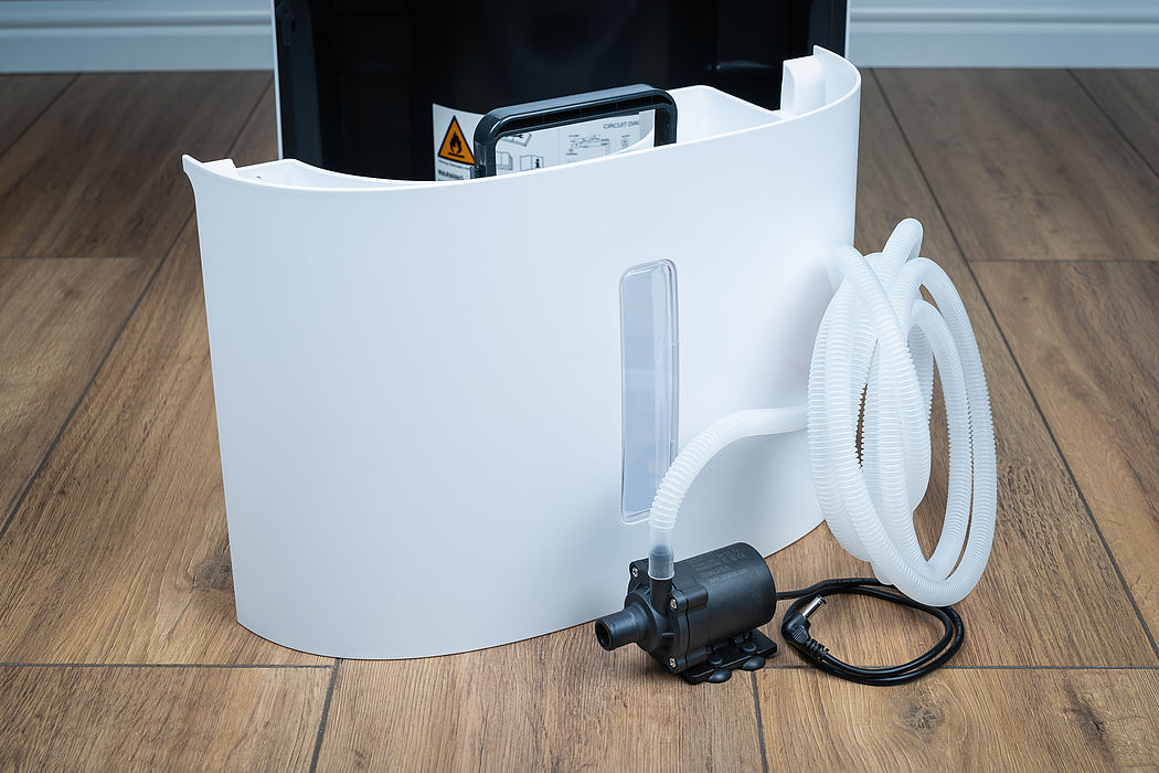Die Pumpe kann auch nachträglich einfach in den Kondensateimer des Gerätes ein- und wieder ausgebaut werden. Der Stromanschluss erfolgt über einen Stecker am Gehäuse des Luftentfeuchters.
