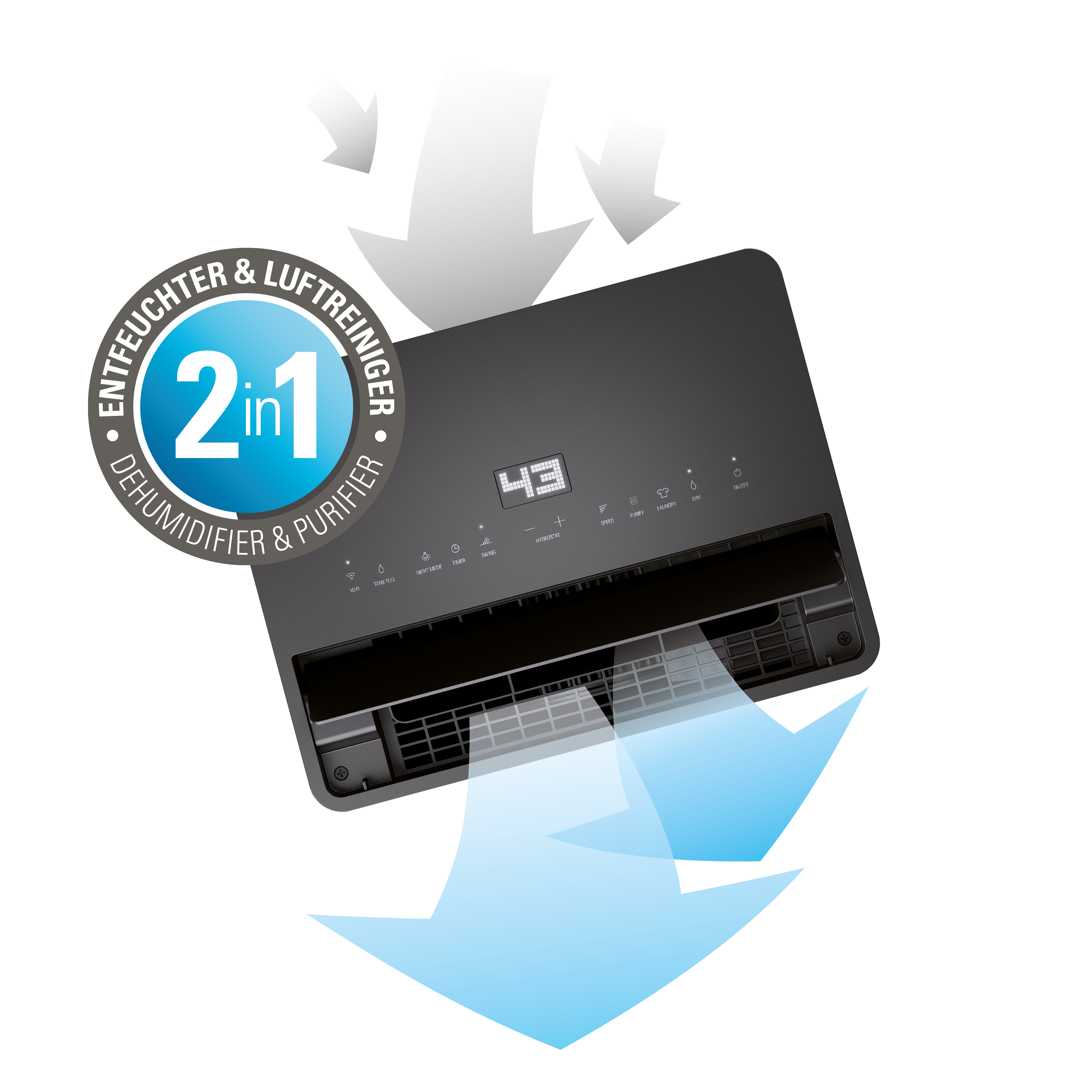 Als 2-in-1-Gerät mit professioneller Superpower sorgt Lukas Pro gleichzeitig für entfeuchtete sowie gereinigte Luft und damit für ein Raumklima zum Wohlfühlen. Dank WiFi lässt er sich mühelos steuern – jederzeit und von überall. Die separat aktivierbare Schwenkfunktion verteilt die Luft optimal im Raum. Der Wäschetrocknungs-Modus trocknet nasse Kleidung im Handumdrehen. Mit einer Entfeuchtungsleistung von bis zu 50 Litern pro Tag eignet sich Lukas Pro ideal für grosse Räume. Der HEPA-Filter entfernt zuverlässig Schadstoffe wie Keime, Pollen, Staub und mehr – Lukas Pro überzeugt daher auch als Luftreiniger und sorgt für hygienische Raumluft. Der Luftentfeuchtungsmodus kann wahlweise aktiviert oder deaktiviert werden. Im Nacht-Modus läuft Lukas Pro besonders leise und unauffällig. Funktionen wie digitaler Hygrostat, Timer,automatische Abschaltung bei vollem Wassertank und die Wahl der Entwässerungsoption – via Wassertank oder Drainage-Schlauch – runden Lukas Pro ab.