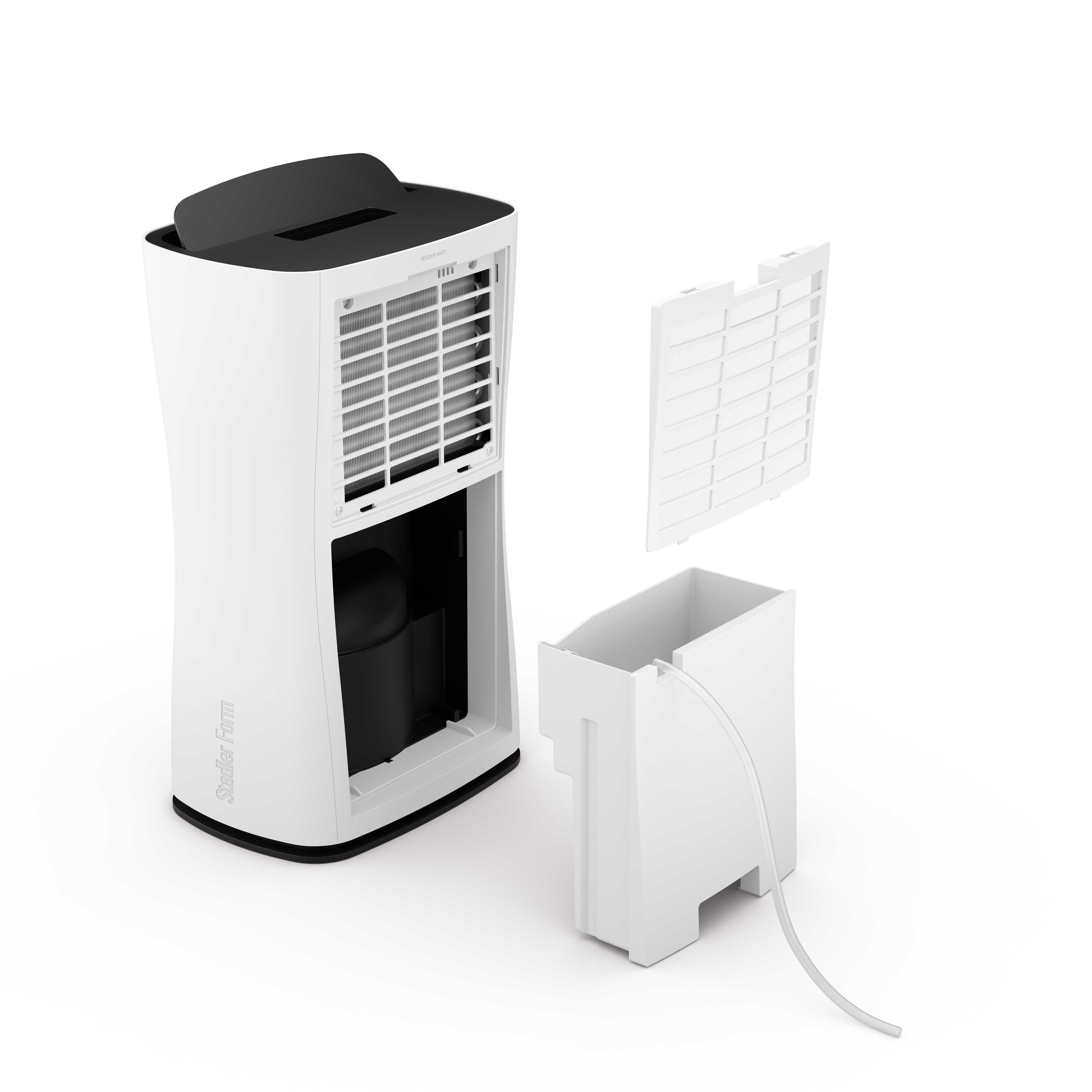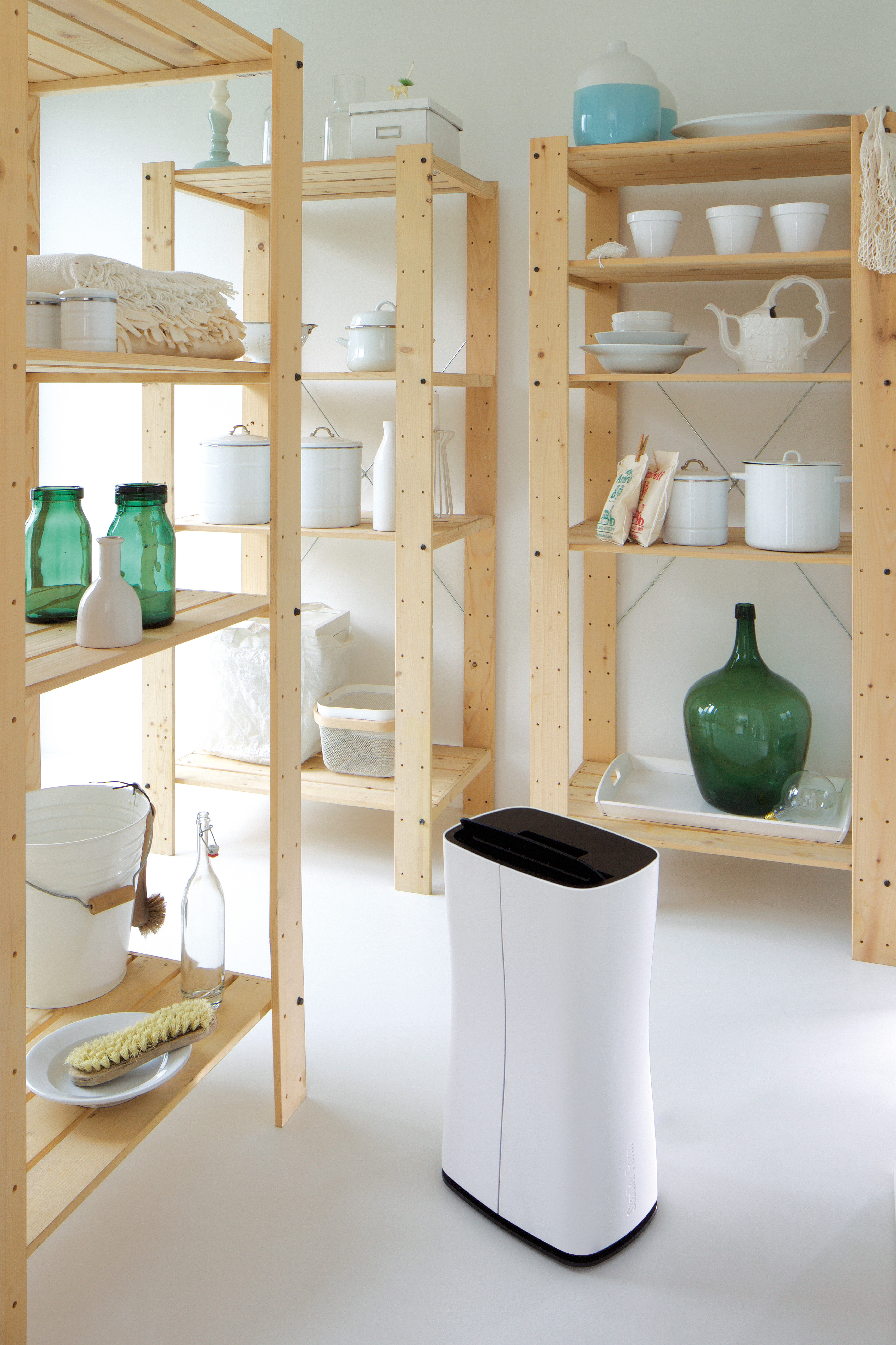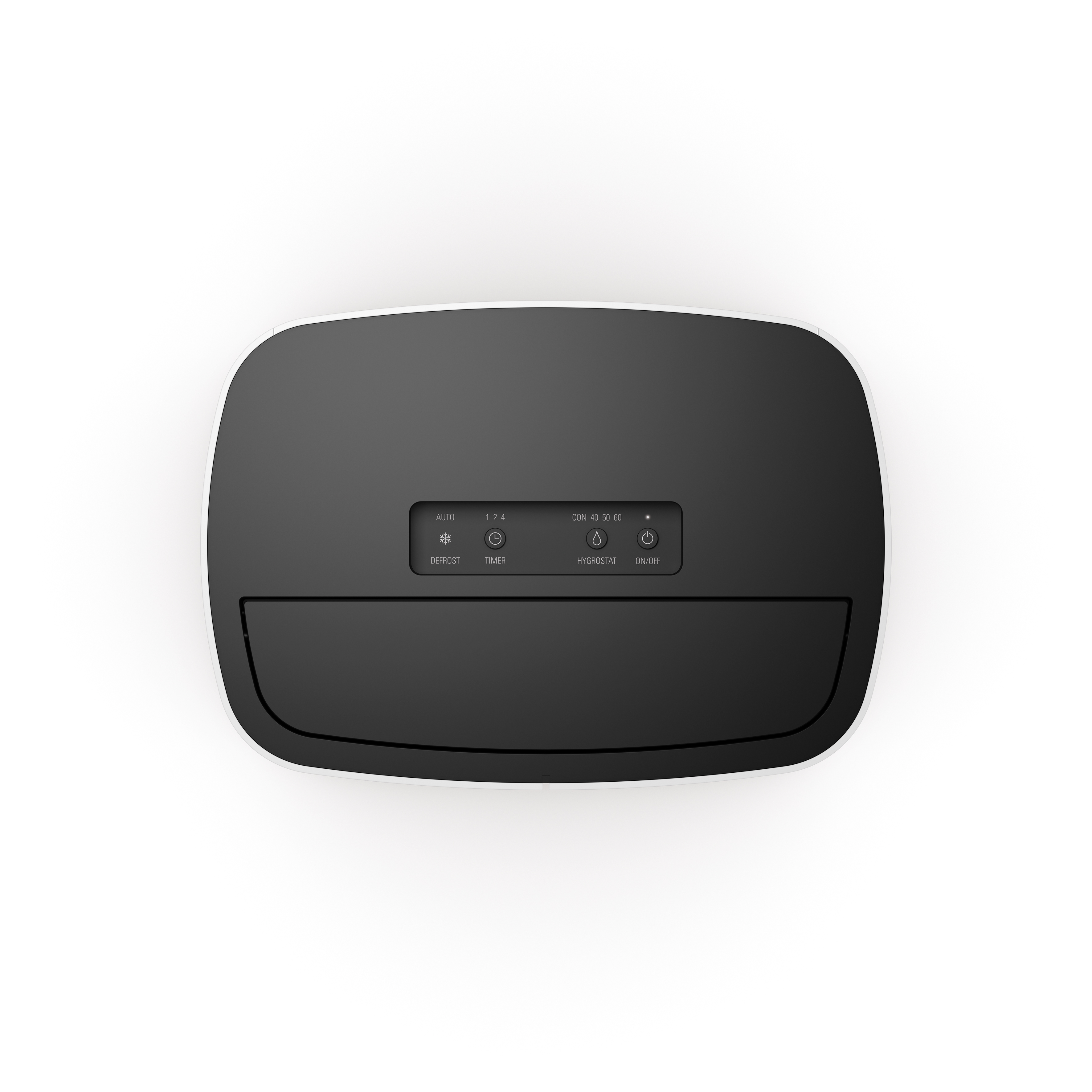 Dank dem integrierten Hygrostat kann die Ziel-Luftfeuchtigkeit auf 40 %, 50 % oder 60 % eingestellt werden. Alternativ läuft Theo im Dauerbetrieb.