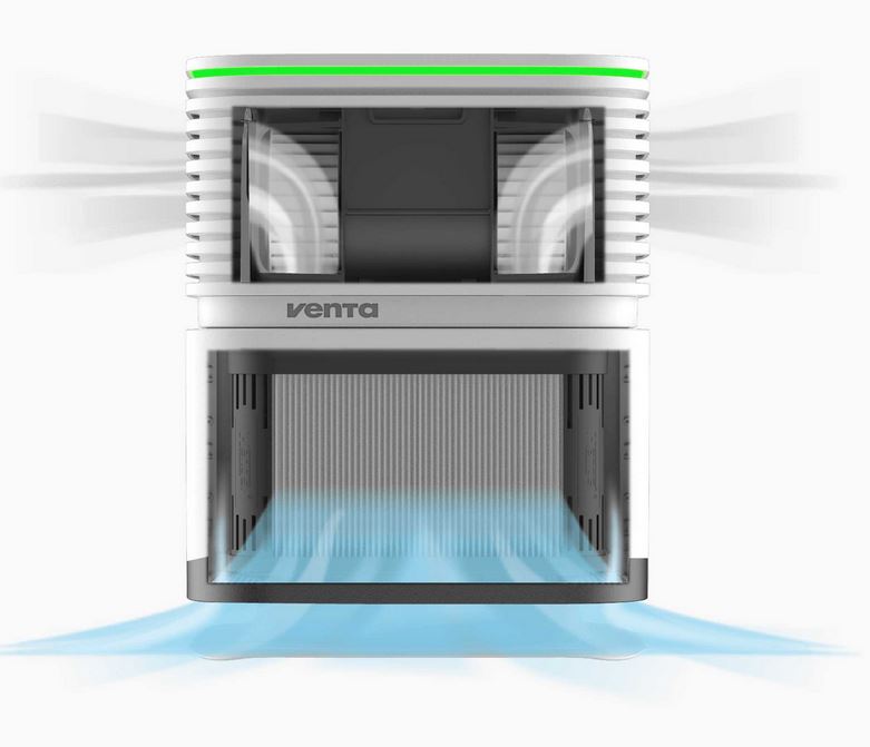Unsere Luftreiniger versorgen Sie mit sauberer Luft, indem sie kleinste und unsichtbare Partikel wie Allergene, Feinstaub, Viren, andere Luftschadstoffe und schädliche Gase bis zu einer Größe von 0,3 Mikrometer bis zu 99,97% aus Ihrer Raumluft filtern. Damit Sie frisch gereinigte und gesündere Atemluft genießen können. So funktioniert’s: Der Luftreiniger saugt die Luft aus der Umgebung ein, reinigt sie gründlich und gibt sie dann über die Venta AirFlow 360 Technologie frisch gesäubert wieder ins Zimmer ab. Der Luftstrom gleitet so kaum wahrnehmbar am Boden entlang und verteilt sich gleichmäßig in Ihrem Zimmer. Durch die smarte Filterkonstruktion werden übrigens auch allerkleinste Schwebstoffe bis 0,3 Mikrometer im Filter festgehalten. Sie wollen es noch detaillierter wissen? Hier entlang.